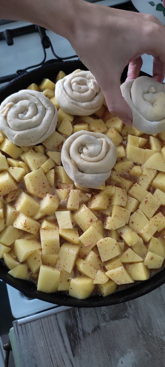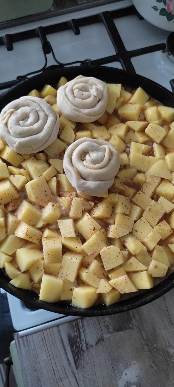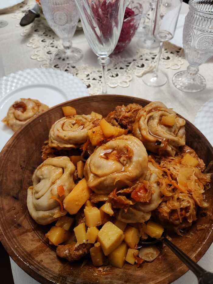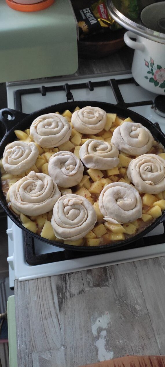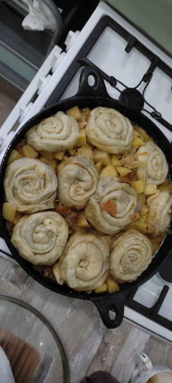 Пока настаивается свинятина с капустой, берем луковицу, режем кубиками и обжариваем. Берем тесто, раскатываем лепешкой и размазываем обжаренный лук по ней. Сворачиваем в рулет и нарезаем в штрудлики. Да, слово смешное.