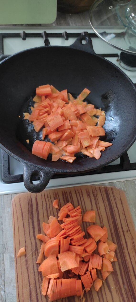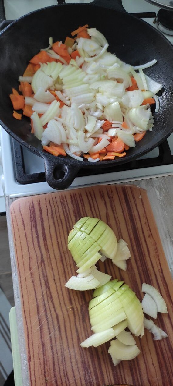 Лук чистим и режем четвертькольцами. В жаровню в раскаленное масло вываливаем нарезанный лук. Мешаем. Мешаем. Мешаем. Лук должен сначала схватиться, потом ужариться и стать полупрозрачным. Но этого мало - продолжаем мешать и ужаривать. До тех пор, пока он не станет совсем мягким. Чувствуете божественный запах? Если да, то вы все делаете правильно.