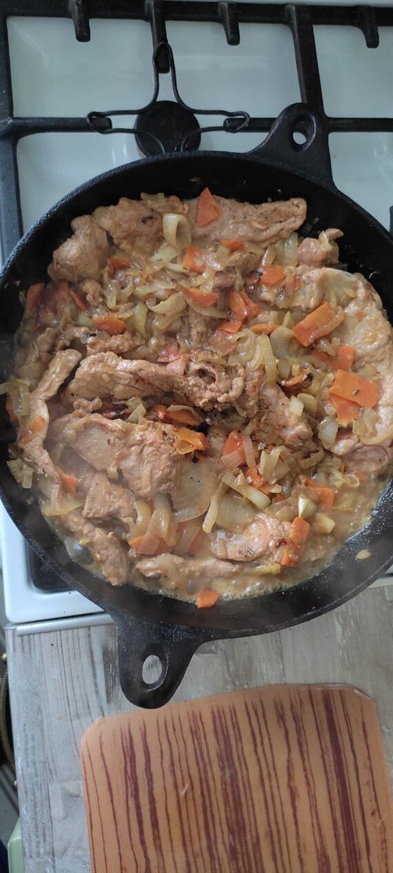 Окей, лук почти готов. Вываливаем в него свинятину. Огонь максимальный. Мешаем свинятину в луке. Мешаем минут десять. Пусть прогреется. Ну а после этого закрываем жаровню крышкой и оставляем тушиться лук с мясом. Разумеется, не забыв убавить огонь. Заметили, кстати, что лук начал растворяться? Он растворится вообще целиком.