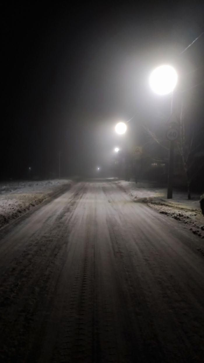 Проезжаем тем временем какие-то незнакомые селения. Периодически снова куда-то сворачиваем. В машине валялся (и валяется) атлас дорог России, дал его сестре, говорю, чекни-ка, где мы, да куда приедем. Не помню, что она там начекала, но ситуация не прояснилась. А тем временем ещё и бензин начал кончаться. И дорога - да, она тоже стала ещё более извилистой и в отличие от М-5, на которой обычно зимой всё же асфальт виден, стала совсем заснеженной. Примерно, как на нижеследующем фото (из интернета), только без искусственного освещения и без таких прямых участков.