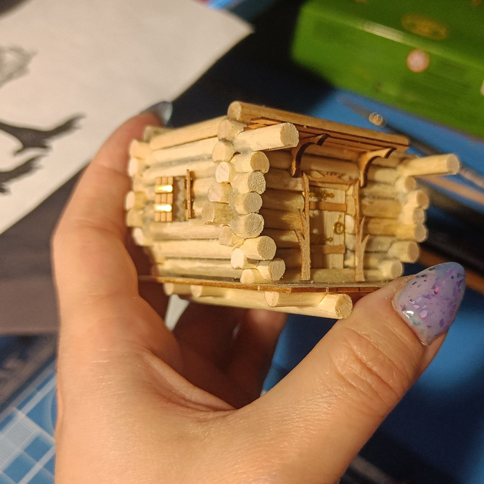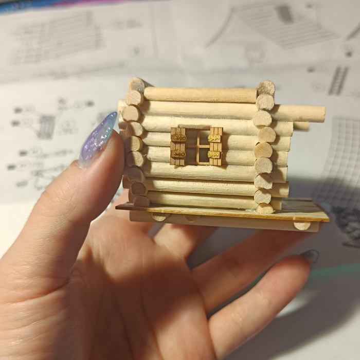 На подготовленном основании брёвна складывались в строго определенном порядке, поэтому, сперва потребовалась их тщательная сортировка по длине и расстоянию от края до полукруглого желоба и, конечно, немалое количество ПВА. В целом, благодаря маленькости набора, разобраться оказалось несложно.