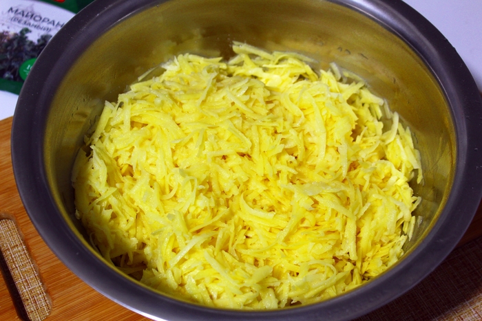 Картошку измельчить любым удобным способом. Можно пропустить через мясорубку, можно использовать терку, мелкую или крупную. Чтобы картофельная масса не потемнела, к ней сразу же добавить натертую луковицу и хорошо перемешать.