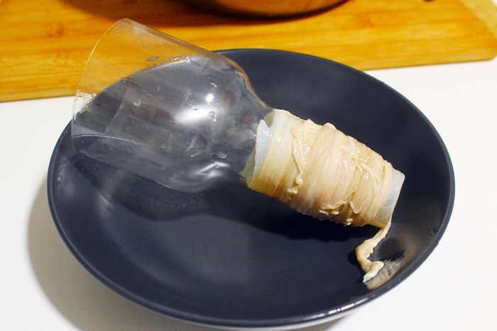 Натягиваю оболочку гармошкой на горлышко бутылки, сразу 2 - 2,5 метра. На конце завязываю узел.