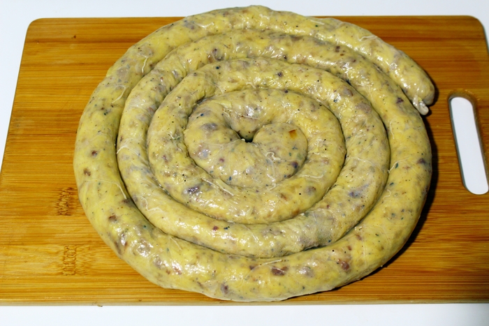 Можно запечь ведерай и в таком виде, так вроде более канонично, но я предпочитаю путем перекручивания разделить длинную колбасу на порционные части.