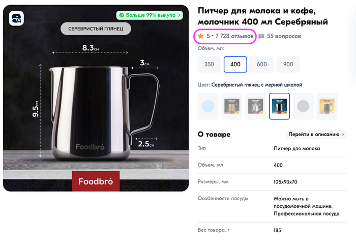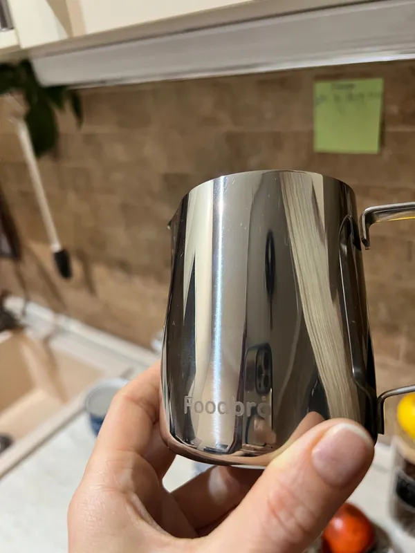 Я тоже люблю кофе и давно хотел питчер. Но дело в том, что я 10 лет работал на европейский металлургический концерн, поэтому все эти поделия из Индии или Китая для меня, как открытая книга. Питчер пока не купил, но для мастерской, связанной с химией, покупали стакан" из нержавейки, тоже с ручкой и градуировкой. Единственный минус - индусы плевать хотели на то, как жидкость будет вытекать. Поэтому просто изогнули край стакана, как смогли. Аккуратная струя не создаётся, жидкость плещется. Ручка приварена точечной сваркой хорошо, на глаз это определить, конечно, сложно. Градуировка, конечно ориентировочная, проверил, отклонение даже меньше, чем у стеклянных "лабораторных" стаканов. Сталь скорее всего марки 430, заливали смесь, содержащую кислоту, теперь не используем, несколько месяцев стоит, ржавчины нет. Но питчер должен быть из стали марки 304 (1.4301), как и другая хорошая посуда для кухни.