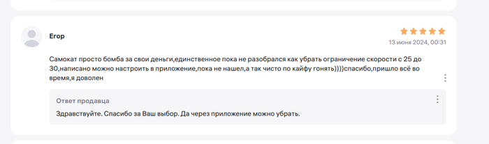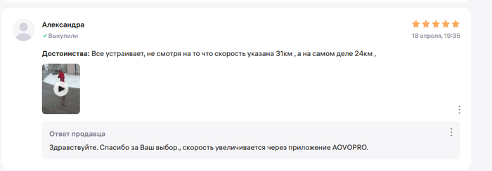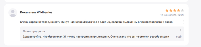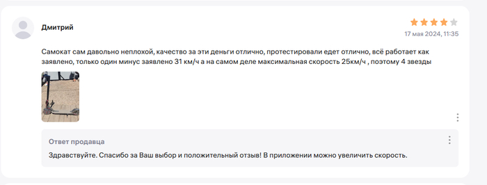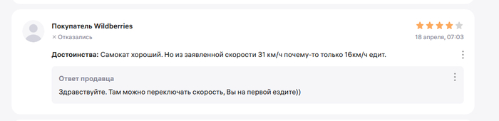 Хотя, при условии, что самокат рабочий я могу его вернуть в течение 7 дней по закону, без всяких гвоздей. А если самокат с браком, то продавец обязан его принять на проверку качества. Это все законы РФ. Но Wildberries и его продавцы используют беспомощность покупателей и тем, что все заявки оформляются на принадлежащем им ресурсе. Таким образом есть возможность манипулировать информацией. Пока я все это писал, решил проверить отзывы по данному самокату - оказалось, что у некоторых людей тоже произошла подмена, но они правда не пишут, что самокат другой, а то что скорость меньше. На что продавец отвечает, что скорость меняется в приложении, но это неправда. Контроллер данной модели выдает 26 км/ч и никакие приложения не поможет.