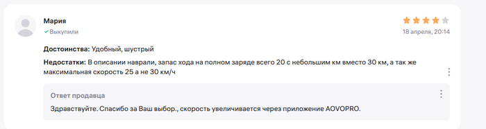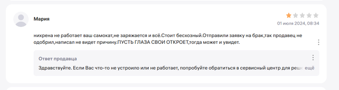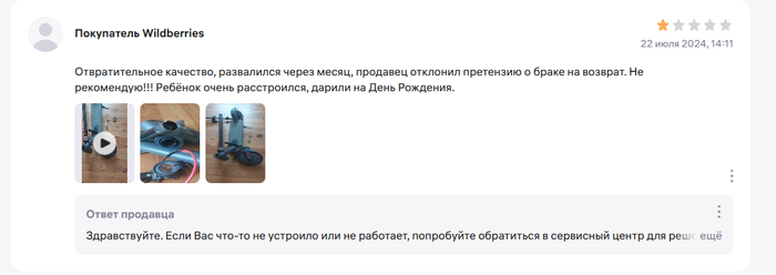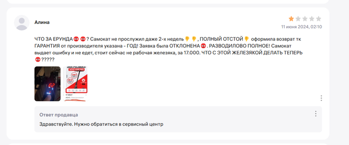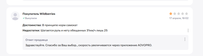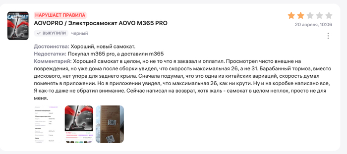 Ну если есть несколько случаев, значит у продавца пересорт, он как минимум должен к возвратам относится спокойно, но он не принимает. И я подумал, а что если продавец намеренно продает худшие самокаты, привлекая объявлением с более лучшими характеристиками. Это бы объяснило факт отказа от любой коммуникации, возврата (я еще напрямую писал, задавал вопросы через форму вопросов к товару). Но это уже мошенничество, уголовная статья. Удивительна позиция маркетплейса, который сделал все, чтобы нарушить мои права. Отзыв, который я сделал на продавца, с объективным описанием по сути, заблокировал.