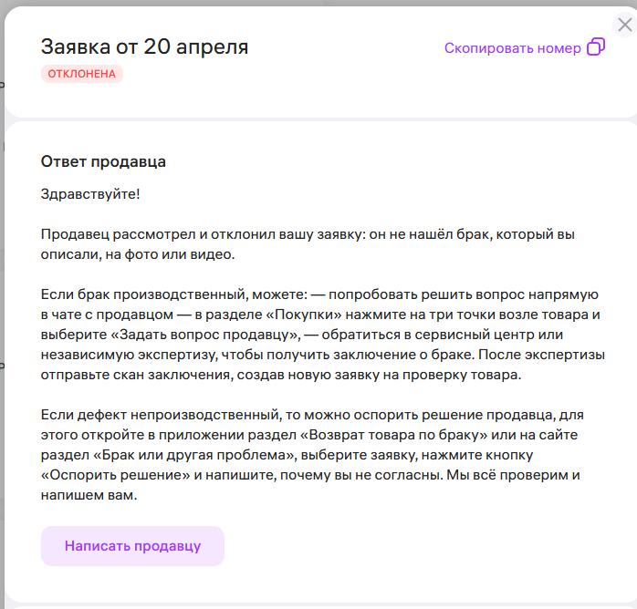 Думаю, ну ладно, раз так давай ещё раз. Написал в Роспотребнадзор и этот же текст вставил в новую заявку на возврат. Результат - опять отказ с той же формулировкой.