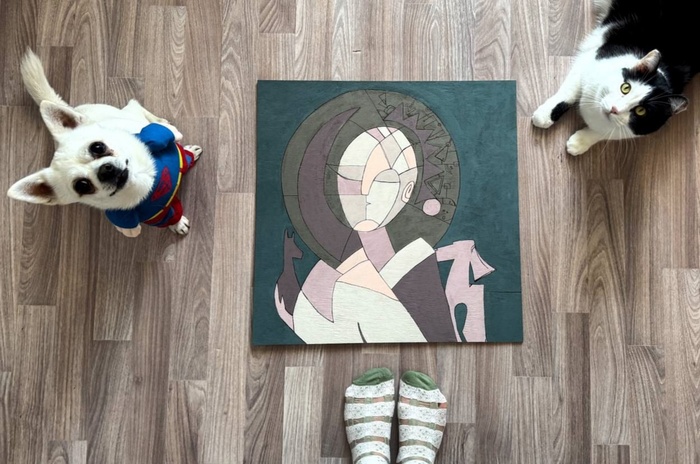 Пришла к вам с описанием картины ) Прошлый котик достаточно хорошо зашел:) Картина из параллельной вселенной . В самом центре собран лик, состоящий из временных и геометрических осколков))именно тут лицо без четких черт , как пустой компас, направленный внутрь . Здесь нет глаз , чтобы смотреть только внутреннее ощущение)