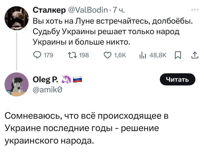 Как же здорово, что, в отличие от Украины, Россия является подлинно демократической страной, и всё, что происходит с ней в последние годы – это решение её народа. Ну, например, это народ запретил самому себе ютуб, народ поднял пенсионный возраст, народ принял решение о начале войны...