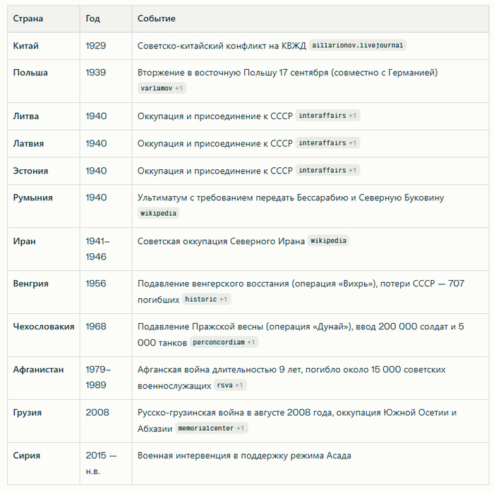 По данным ИИ: За последние столетие СССР и Россия осуществили военные действия против примерно 15 независимых государств.