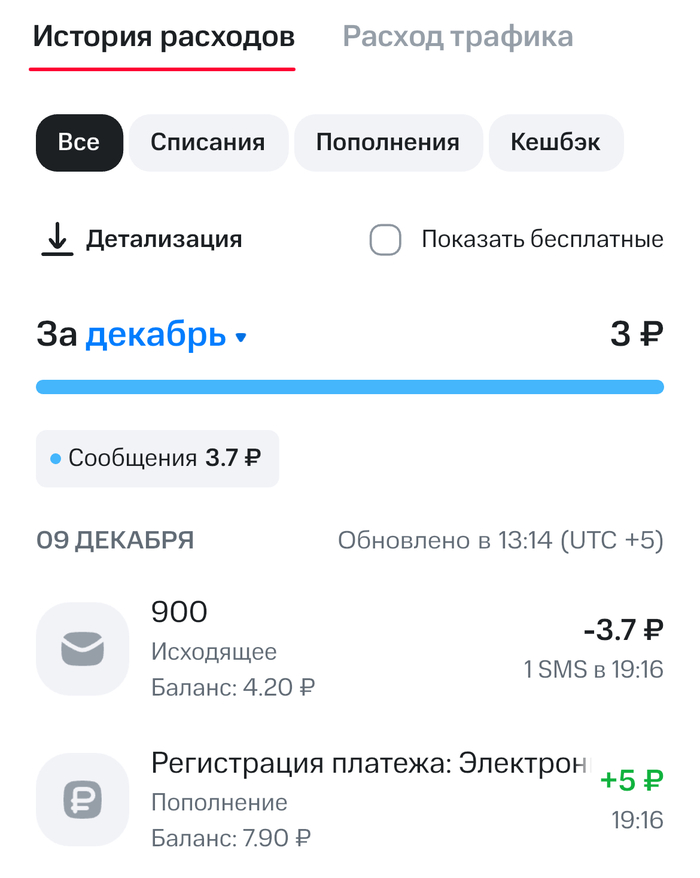 На тот момент на балансе было около 2 руб., пакет смс не израсходован. Странно, но думаю закину еще немного, может уйдет, ну вдруг платное. И Бинго! Сообщение ушло, а с баланса списали 3,7 руб.