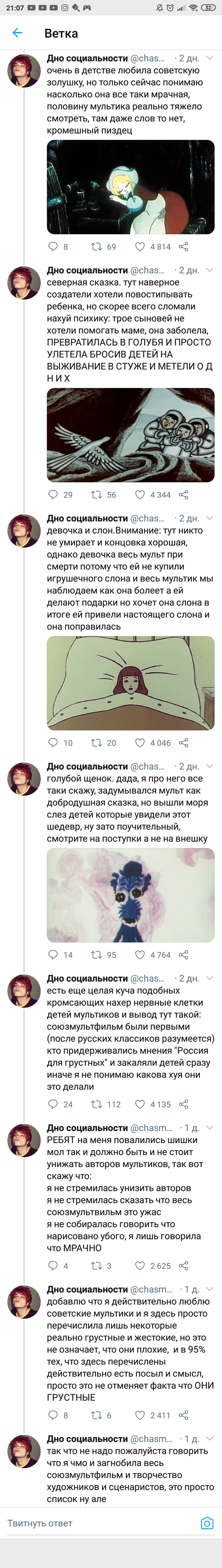Все что вы смотрели в детстве, можно смело пересматривать в зрелом возрасте, и вы откроете для себя мультипликацию с другой стороны. В детстве для вас это сказочный мир, но по мере взросления вы увидите острые грани социальных и других проблем, актуальных во все времена, но их сможет понять и прочувствовать только взрослый человек, набравшийся опыта и хлебнувший с горкой взрослой жизни. Спросите почему? А потому что мультфильмы и сценарии к ним пишут те же взрослые люди, их разум уже содержать кусочки житейского опыта. Писатели и художники осознанно и неосознанно вставляют эту горькую пилюлю пережитого в свои произведения. Психика человека устроена так, что на подсознательном уровне воспринимает более обостренно проблемы которые сам когда-либо пережил: одиночество, потеря близкого человека и так далее.