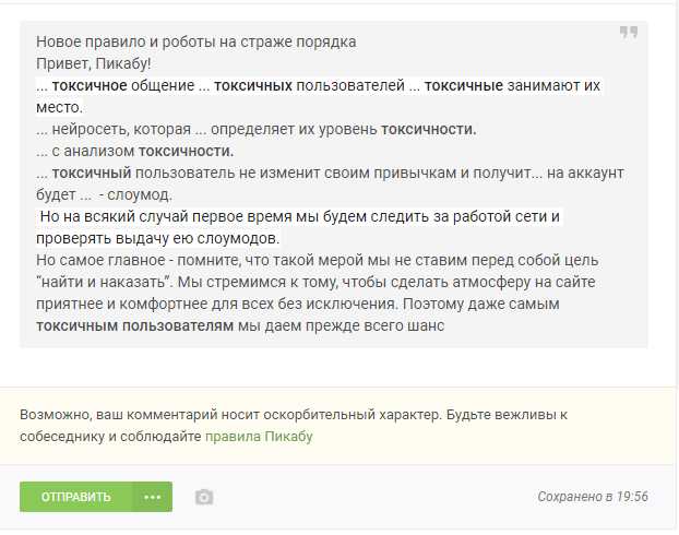 ВНИМАНИЕ! На сайте уже работает одна сеть, которая выдает предупреждение при написании комментария. ЭТО НЕ ТА СЕТЬ, она носит исключительно информационный характер и не связана с анализом токсичности. Пожалуйста, учтите это.