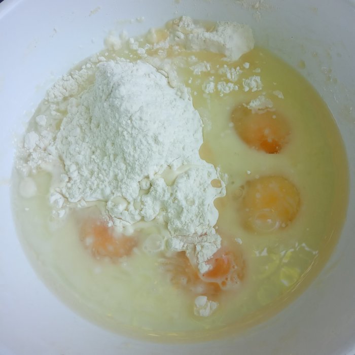 Порция первая - тщательно смешал яйца с солью. Добавил половину молока и слегка взбил. Высыпал всю муку, еще раз перемешал, чтобы не было комочков. Добавил оставшееся молоко, взбил и поставил в холодильник на ночь. Утром влил в смесь воду.