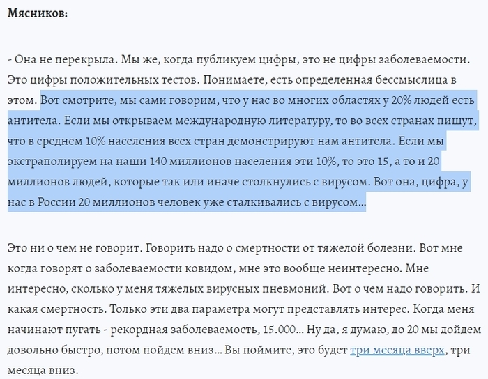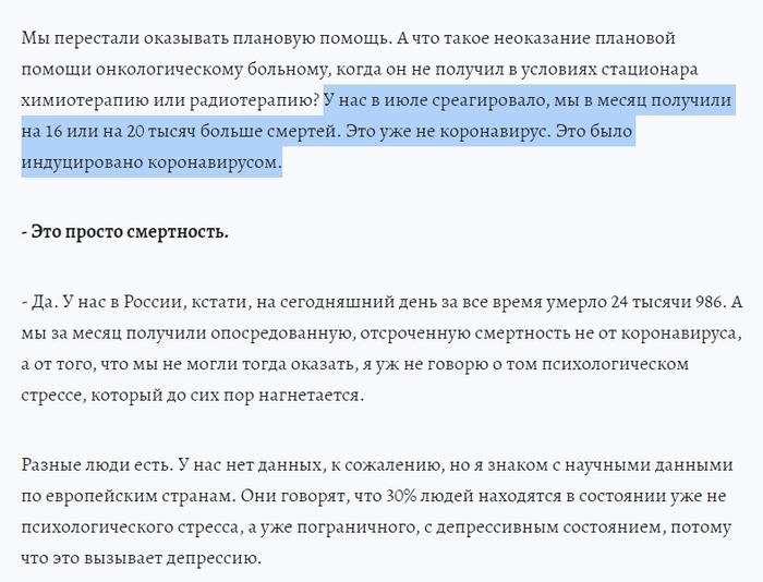 Во-вторых, опыт и практика первой волны, я думаю, даст нам пережить вторую с относительно невысокими потерями. Да, мы все (хоть области, хоть страны) - не Китай. Но везде многое предпринято, исходя из опыта волны первой. Да, врачи и больницы работают сегодня на пределе, но они работают. Обеспечиваются они тоже на пределе, но - обеспечиваются. Вывозят всё вот это на пределе, но - вывозят. Смерти есть и будут, это факт. И их будет немало. Но если бы не были приняты все те меры, которые так или иначе были приняты, - смертей было бы в разы, а то и на порядок больше.