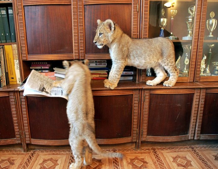Этот львёнок вполне себе жил прям дома у дрессировщика.