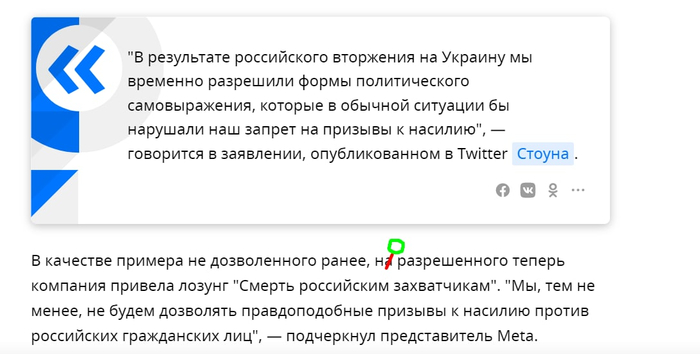 «В результате российского вторжения в Украину мы временно сделали поправку на формы политического выражения, которые обычно нарушают наши правила, такие как агрессивные высказывания, такие как «смерть российским оккупантам». Мы по-прежнему не допустим заслуживающих доверия призывов к насилию против российских граждан», — говорится в заявлении представителя Meta.
