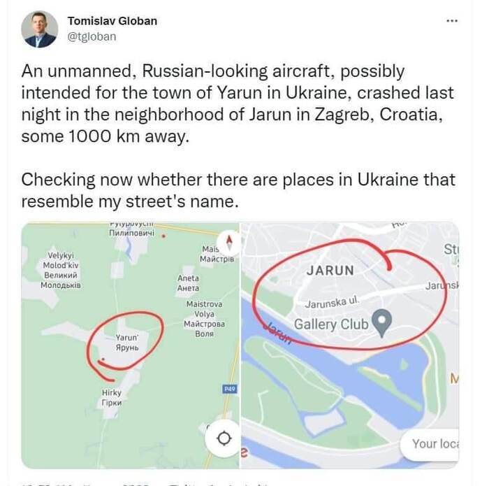 Летательный аппарат упал в ночь на 11 марта в зеленой зоне в одном из районов столицы Хорватии, раздался взрыв, на месте осталась воронка. Полиция обнаружила поблизости два парашюта. Предположительно, это может быть БПЛА Ту-141 "Стриж" советского производства, прилетевший с Украины.