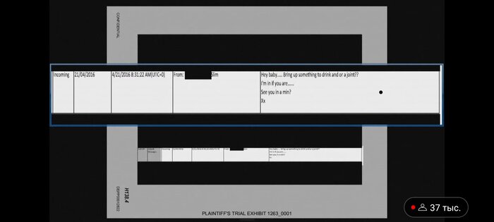 Показано текстовое сообщение, связанное с ужином в честь 30-летия Херд в 2016 году. Оно гласит: "Эй, детка, принеси косяк и выпивку. Я в деле, если ты будешь. XX".