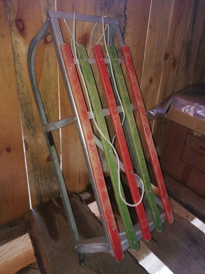 Однако понимал, что штука эта была не дешёвая, а вот санки у меня были. И были они ещё со времён детского сада. Местами поржавевшие, немного помятые, покоцаные, зато свои. Как пошёл в школу, так снял с них заднюю дугу-спинку, ибо не гоже совсем взрослому пацану с ней кататься, да и как на санках лёжа на пузе кататься с этой фиговиной? Примерно вот такие, и также c зелёно-красными досками.