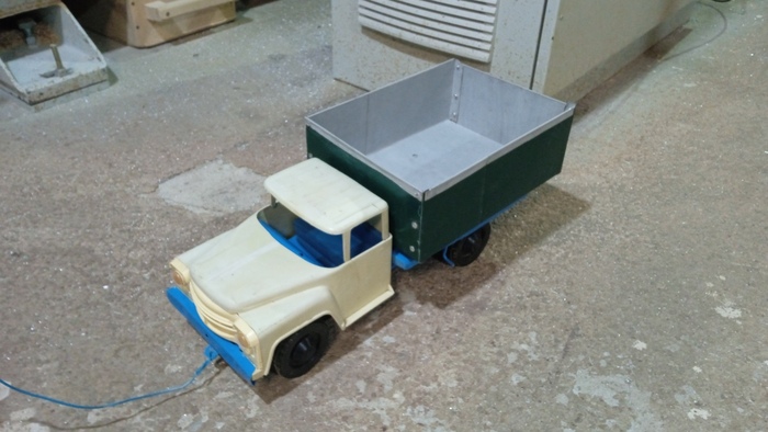 Ну а вот в прошлом году я купил дачу и в сарае раскопал такой же ЗИЛ-Автокран, только уже без стрелы и прочего автокранства. Сын вдруг захотел такую же машинку, только в исправном состоянии. Но у него в копилке не было столько налички, сколько просят за эту рухлядь на авитах. Меня, естественно, задушила жаба, поэтому сошлись на том, что восстановим эту. Дальше фото, было-стало. Со стрелой заморачиваться не стали, поэтому ЗИЛ-зерновоз :). Отрихтовали, отмыли кабину, покрасили, и из куска профлиста слепили кузов.