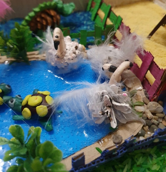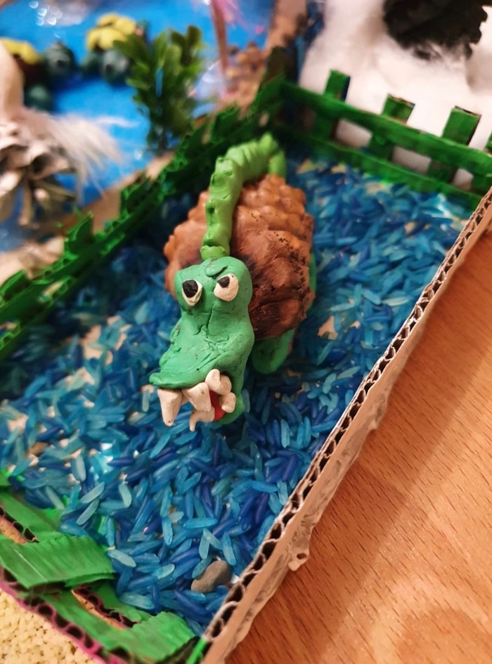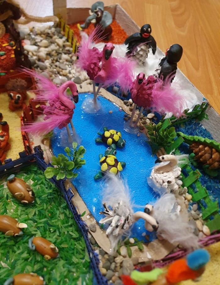 Дочке 5 лет. Я придумала идею, сделать зоопарк из природных материалов. Помогла ей залить озеро, склеила основу. Вместе покрасили рис, пшено и семечки дыни. Дочка сама лепила животных. Основа каштаны, шишки и желуди. Сама раскрасила вольеры и заселила животных. Делали мы с ней в удовольствие, каждый вечер по чуть-чуть, заняло это все неделю. Кайфанули обе.