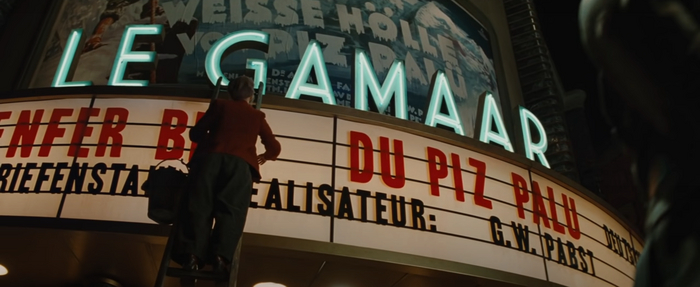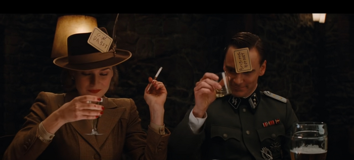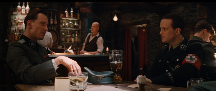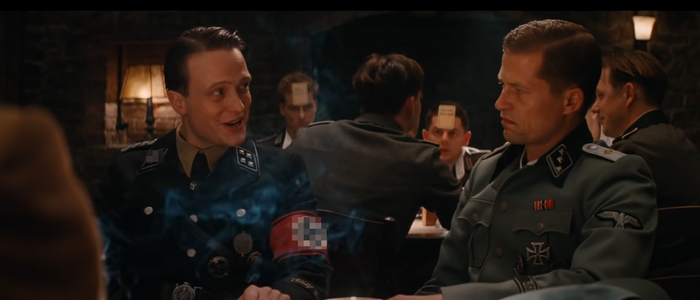 Итак, сцена в пабе. Дитер Хельстром пытается выяснить что здесь делают ублюдки и как во всем этом замешана фрау Фон Хаммерсмарк. Первоначально может показаться, что ублюдков выдал нетипичный для немцев жест с тремя пальцами, так как в этот момент выражение лица Дитера резко меняется от расслабленного к враждебному, он направляет свой Вальтер на Хикокса, но тем не менее Хельстром не говорит, что их выдал именно этот жест. Это предположение озвучила только фрау Фон Хаммерсмарк. Он раскусил ублюдков намного раньше, как только подошел к столу. Он не просто подозревал, он был уверен, что объясняет всю неловкость, которая царила до появления того самого жеста. Дитер обращает внимание на странный акцент Хикокса, тот в попытке оправдать свой очевидный иностранный акцент отвечает, что он родом из деревни у подножия Пиц-Палю, и что в тех местах все так говорят. Хикокс утверждает, что он снимался в фильме с Рифеншталь режиссера Пабста. Он уверен, что Хельстром не видел этот фильм или по крайней мере видел очень давно и смутно помнит, что в нем было, но чего Хикокс точно не мог предвидеть, так это то, что фильм «Белый ад Пиц-Палю» буквально вчера показывали в кинотеатре Шошанны, и когда Фредерик Колер благодарит Шошанну за организацию вечеров немецкого кино для офицеров, мы можем видеть афишу: Георг Пабст «Белый ад Пиц-Палю» с Рифеншталь в главной роли.