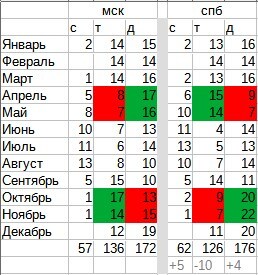 Но за год в Питере чуть больше солнца и дождей и меньше тумана.