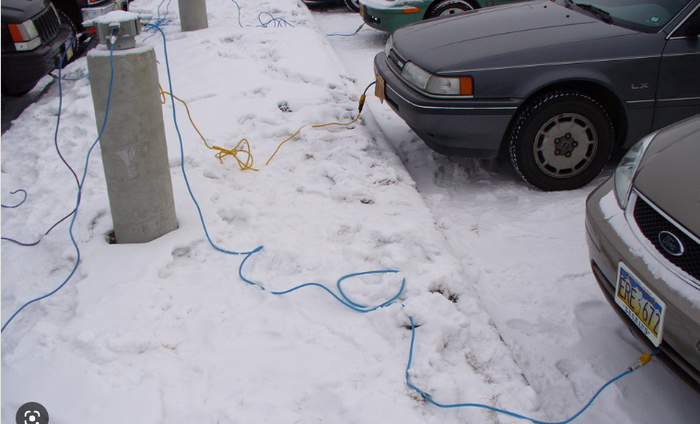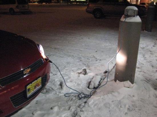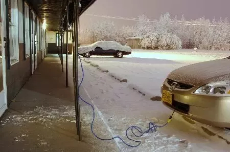 Идти можно, конечно, как всегда своим путём. С картонками, одеялами, и этими "мягкими гаражами". Но мне больше понравился системный подход к вопросу холодной эксплуатации автомобилей одной бывшей нашей территории. На Аляске бывает давит не хуже чем у нас в Якутии. Может и -50 легко. Городские власти решили это довольно просто. В местах где жители ставят авто, парковках, возле торговых центрах, устанавливается множество столбиков с уличной электрической розеткой 110V.