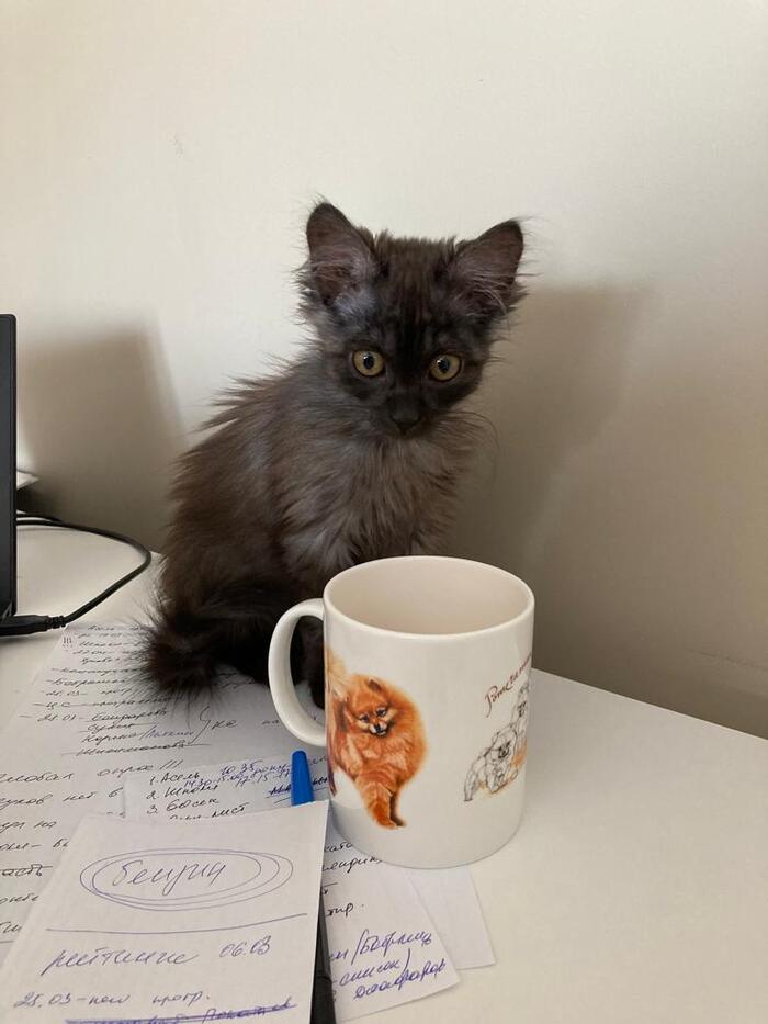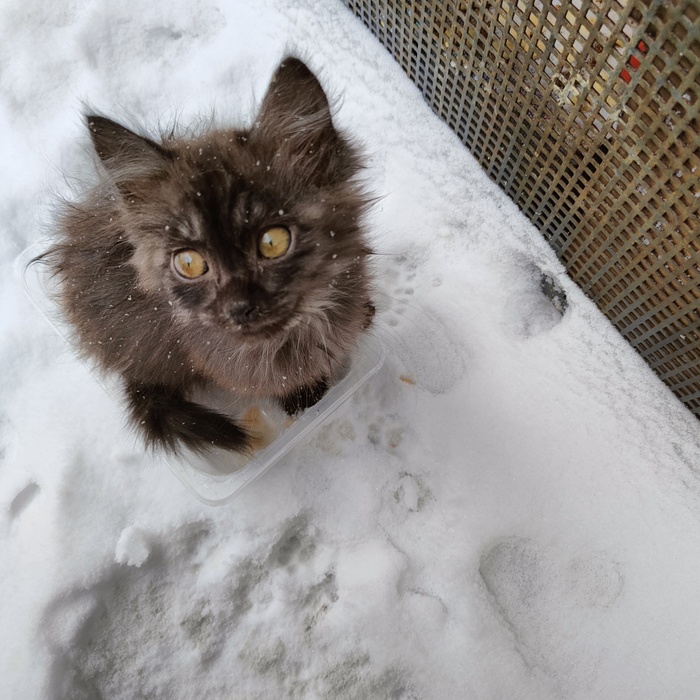 Стоит подойти к подвальной дырке и начать накладывать корм, эта малявка сразу выскакивает. Чтобы не ждать на снегу, залезла мне на коленку. Выглядит месяца на 2, но, судя по величине братьев, месяца 3. Но очень маленькая, вряд ли вырастет крупной. Окрас - обалденный, настоящий "черный дым". Будет очень пушистой, красивейшей кошкой.