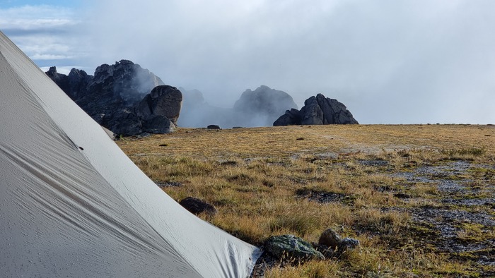 Опять успели поставить палатку до дождя. Пока заваривали сублиматы и пили чай непогода ушла, оставив за собой сюрреалистичные виды в стиле фэнтези. Кажется, прилети с открывшихся ущелий дракон, мы бы приняли это как должное.
