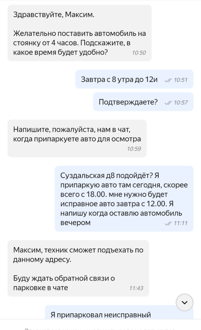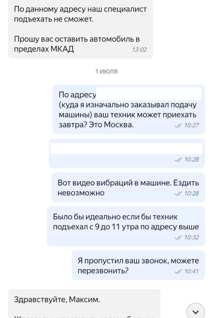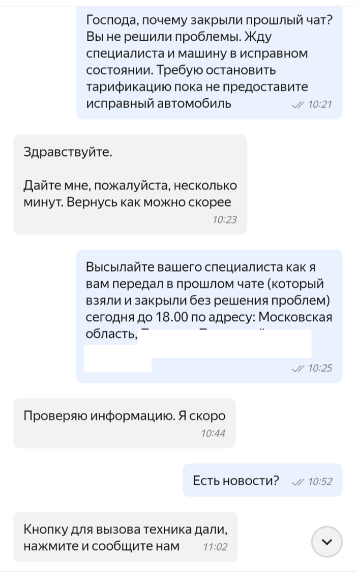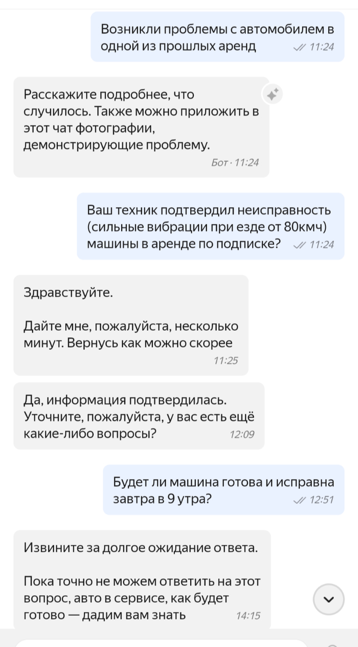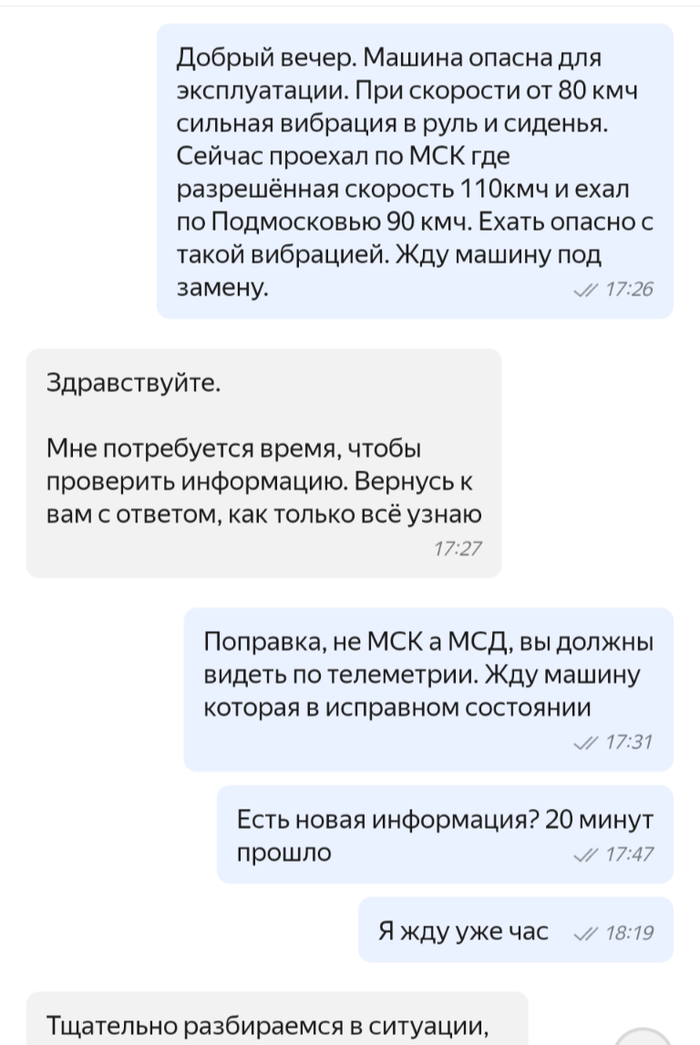3. Если Яндекс Драйв вам отказал в замене, то они будут ее "чинить". Что это означает? Вам придется снова дотолкать ваше авто, за которое вы, напоминаю, заплатили на месяц вперед, в пределах МКАДа и потом через поддержку ("голубиная почта") договориться, когда приедет техник от Яндекс Драйва для "осмотра". Это первый этап. И не ведитесь на сообщения от поддержки Яндекс Драйва, что они там согласуют какой-то временной интервал. Это ложь. Техник приедет, когда приедет. Также никакой связи с техником не будет - ни по телефону, ни через сообщения. И что-то объяснить/показать технику на месте - не получится.