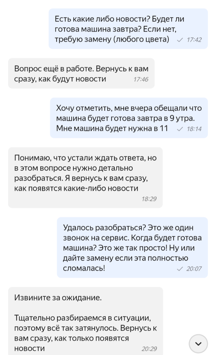 В общем, каждому стоит десять раз подумать, хотят ли они ввязываться в такие отношения с Яндекс Драйвом, где машины с пометкой "почти новая" находятся в исключительно ужасном техническом состоянии (и это машины от 3.5 млн рублей), где никакой связи с менеджерами нет для решения проблем, а есть только связь с девочками и мальчиками из поддержки; где, если у вас появилась проблема, поддержка переходит в режим "будет отвечать каждые 6 часов, может, отстанет"; где, если машина развалилась, вы отвечаете за то, как ее дотолкать в пределах МКАДа; где, заплатив за большой срок, есть риск остаться без машины на неделю; и где никто ни за что не отвечает и никто ничего не компенсирует.