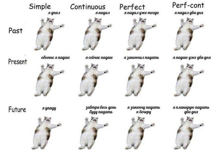То есть, говоря по-простому, времена есть, да. Только вот они нахер не вперлись даже самим англоговорящим. Из 12 времен употребляются реально часто 2, ДВА, Карл! Ну чтобы совсем быдлом не быть, можно добавить наши любимые Present Progressive, Present Perfect и Future Simple. И это закроет нужду в 97% времен ВЕЗДЕ вообще - хоть в умно написанной книжке, хоть в сериале с одними матами, хоть в реальном общении.