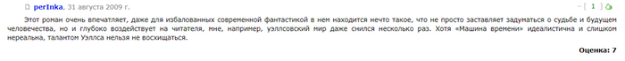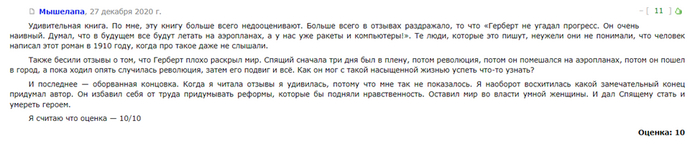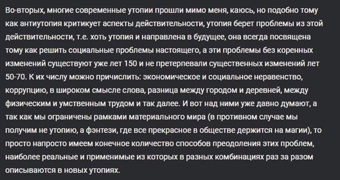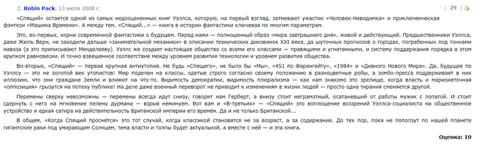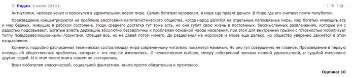 Да, многие проблемы, описанные в романе, особенно в отношении устройства высшего общества – романтические бредни по ушедшему времени, когда трава была зеленее, люди жили в сёлах и мужчины бегали с мечами защищая женщин. Присутствует недвусмысленная критика капитализма: чувствуется что автор реформист-социалист (Ну конечно до того как он начал разочаровываться в человечестве и собственных начинаниях и не пришёл к выводу, что человечество переоценено). У общества есть проблемы, они серьёзные, но в целом, антиутопия выглядит мягкой... Если не знать к чему она приведёт.