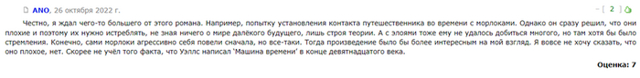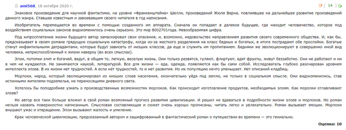 Произведение, не нуждающееся в представлении. Первое, и по совместительству одно из наиболее известных, крупное научно-фантастическое произведение Уэллса, давшее начало направлению хронофантастики – было издано в 1895 году и представляло собой переработку идей из более раннего, ещё со школьных времён, рассказа Уэллса – «Аргонавты времени» (Как мы можем судить кроме идеи машины времени, ничего в новое произведение не перекочевало). Данное произведение Уэллса, также относят к антиутопичным произведением (конкретно тому направлению дистопии, которая отображает мир после апокалипсиса), но хоть это действительно так и, более того, «Машина времени» представляет собой прекрасное произведение, нас, в рамках данного эссе, интересует не всё произведение, а лишь первая его половина, посвящённая устройству общества элоев и морлоков.