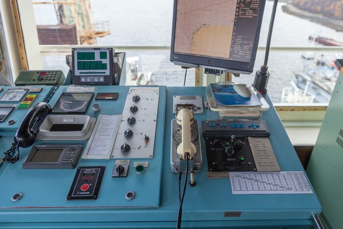 У меня не было времени разбираться с описанием и назначением множества приборов, поэтому в общих словах. Отсюда ведется управление тремя гребными электродвигателями, также на капитанском мостике на пульте находятся приборы контроля и за буксирным устройством, панель управления камерой наблюдения за буксиром, индикаторы лага, эхолотов, репитер гирокомпаса, УКВ-радиостанции и так далее, вплоть до джойстика управления ксеноновым прожектором 6 кВт.