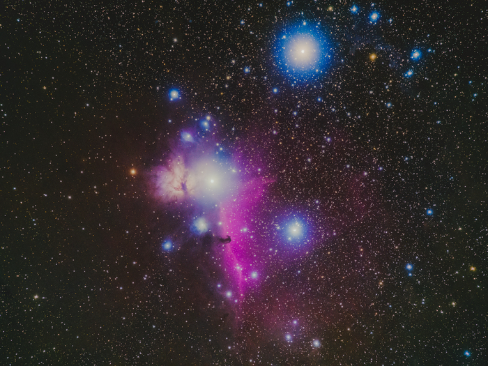 Орион, будучи красивейшим созвездием для наблюдения невооруженным глазом, очень богат и другими объектами, которые невооруженному глазу не очень доступны. На этом достаточно широкоугольном снимке можно увидеть пояс Ориона, туманность Ориона, туманности "Пламя" и "Конская Голова" и много чего еще (и даже комета C/2020 M3 засветилась: кто найдет, тот молодец. Снимок, если что, не очень свежий, сделан осенью 2020 года).