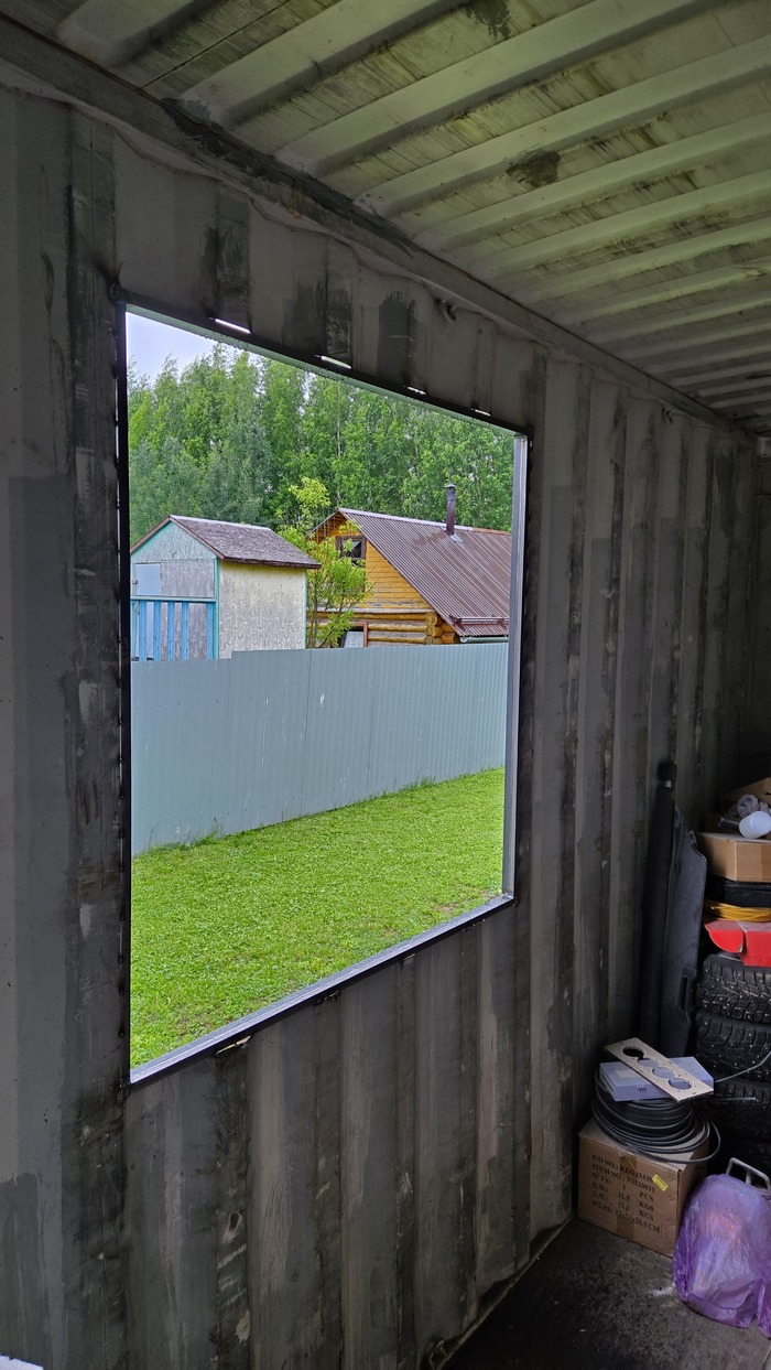 В контейнере-складе-мастерской появились окно и дверь. Притом окно вообще отдали бесплатно, что каёф! Для того, чтоб туда что-то установить - надо прорезать сталь (болгаркой пилил, за пилкой для сабельной по металлу было лень ползти), вварить в тонкую стенку раму из профиля (я взял 40х20), покрасив её и замазав швы герметиком полиуретановым, а уже потом только ставить окно или дверь.