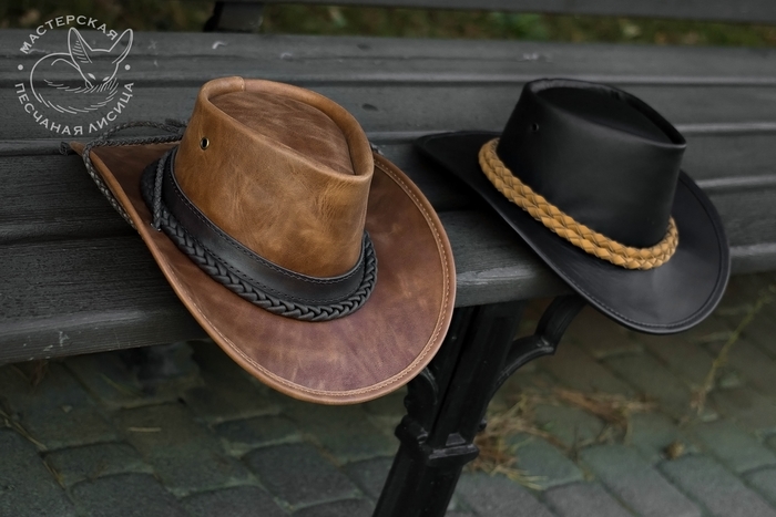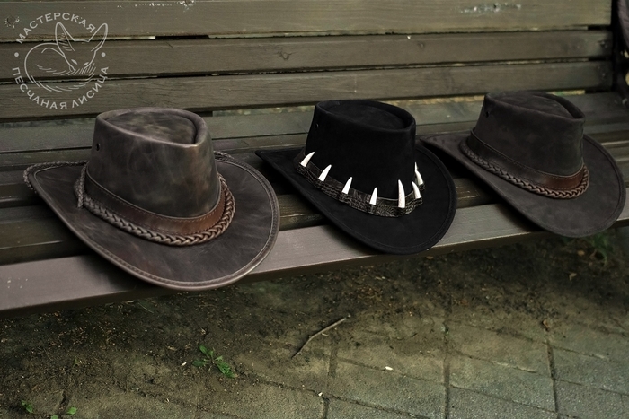 Австралийские шляпы из кожи премиум-качества. Все показанные изделия - полностью ручная работа, все швы в две нити, шляпы изготовлены с учетом индивидуальных пожеланий заказчиков. Это индпошив по меркам, головные уборы сшиты на заказ и благополучно уехали к своим хозяевам.