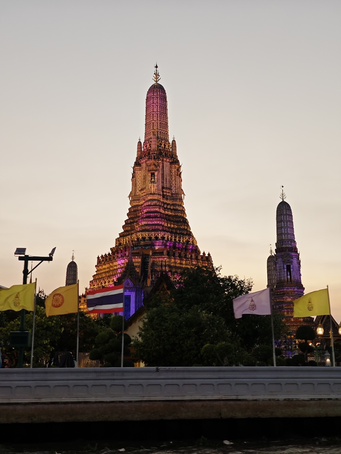 Идём на пирс "докатывать" наш абонемент. Сначала доезжаем на пароме до самой северной точки маршрута. Там все выходят. Мы сидим. Нам никто ничего не говорит. Паром отходит от пирса некоторое время просто стоит посреди реки. Потом разворачивается и мы едем обратно. К этому времени начинает темнеть и на Ват Аруне включают подсветку.