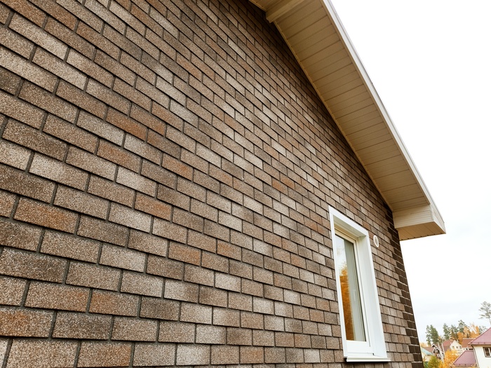 Фасад довольно простой, без каких то излишек, стандартная плитка с битумной основой, все ровненько, не деформирует не ведет.