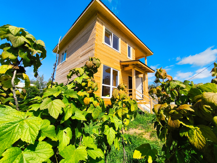 Домик построил этим летом. Два этажа, 100 м2. Строился из бруса естественной влажности. Материал не дорогой, и даже сейчас по 18 000 за м3 можно купить. От того и такой популярный. Из бруса строят у нас все, много, от того видеть такой дом привычно и не боязно на своем участке.