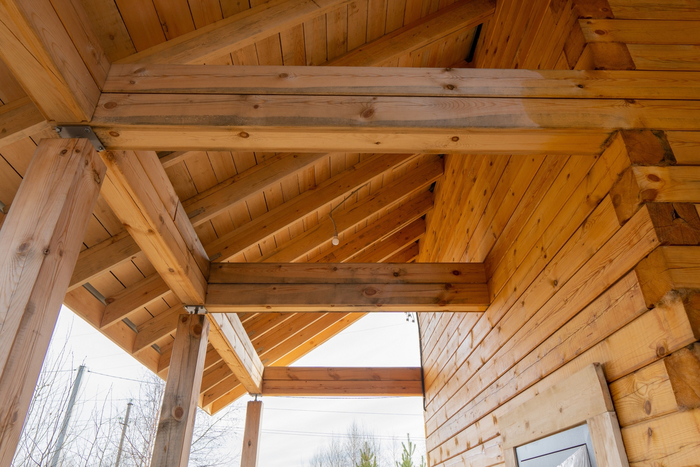 Сама коробка из бруса 180х180 мм. Строился из зимнего бруса, после острожки смотрится славно. Светлая древесина и запах за несколько десятков метров. Внутри так вообще до головокружения.