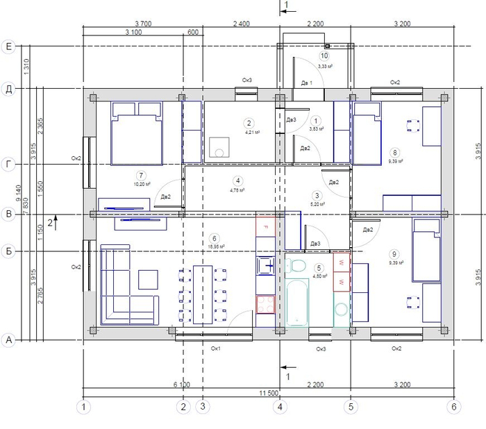 Я построил небольшой дом размером 9 на 11,5 метров. Хороший уютный домик для семьи с спальнями для двух детей, для хозяина и небольшой кухней-гостиной.