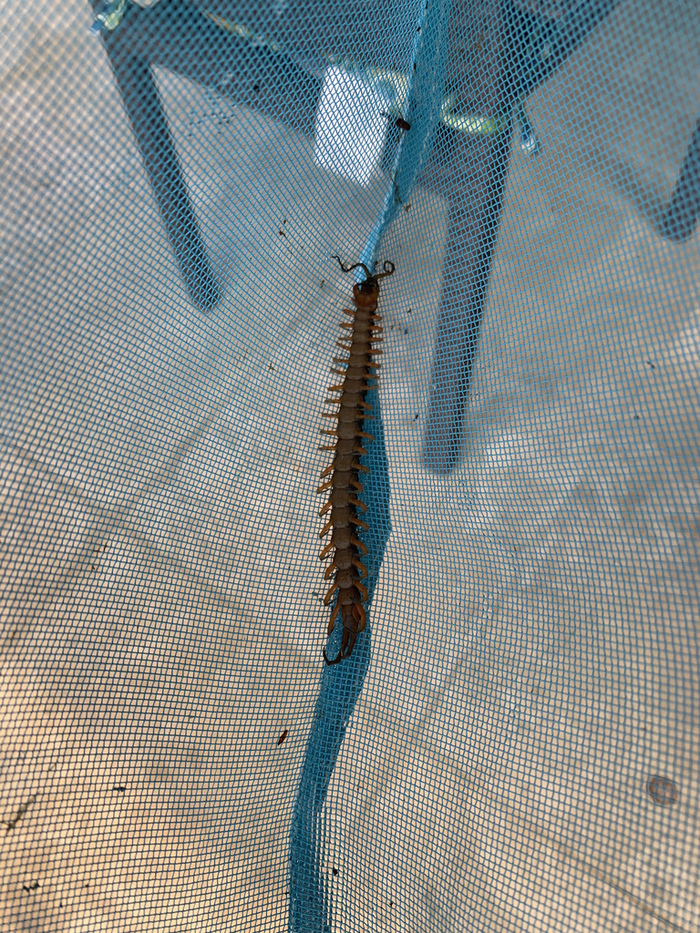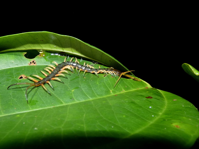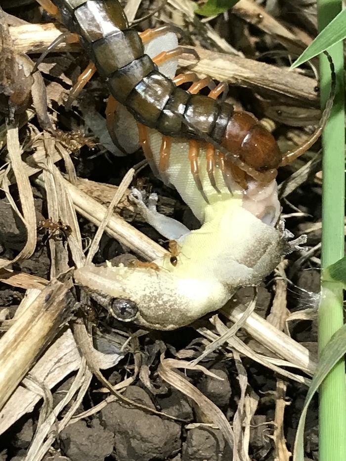 Помимо кусалок наша сороконожечка может обороняться пинками - рубящами ударами можных когтей на последней паре ножек из задницы. В них нет яда, но херачит она ими знатно и ощутимо.