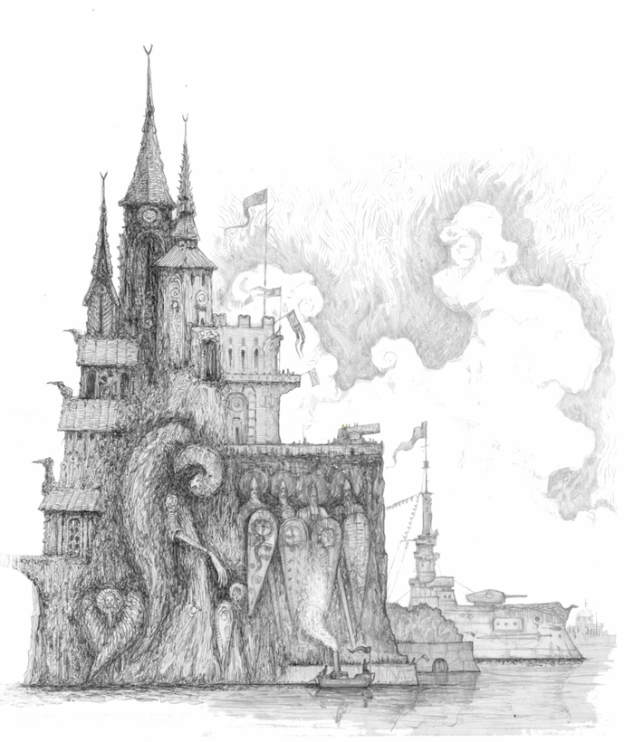 Что-то чудовищное творилось внутри, в проклятом корабле. Он весь гудел и трясся, будто живой, подыхающий зверь, в брюхо которому выстрелили зажигательной ракетой. “Драконабоица!” — крикнуло сердце. Царь повернулся, ожидая увидеть пушку разрушенной, но орудие было цело. От выстрела с неё только слетела вся накладная резьба, её осколками убило директора музея, но даже мёртвый он замер в ликующей позе.