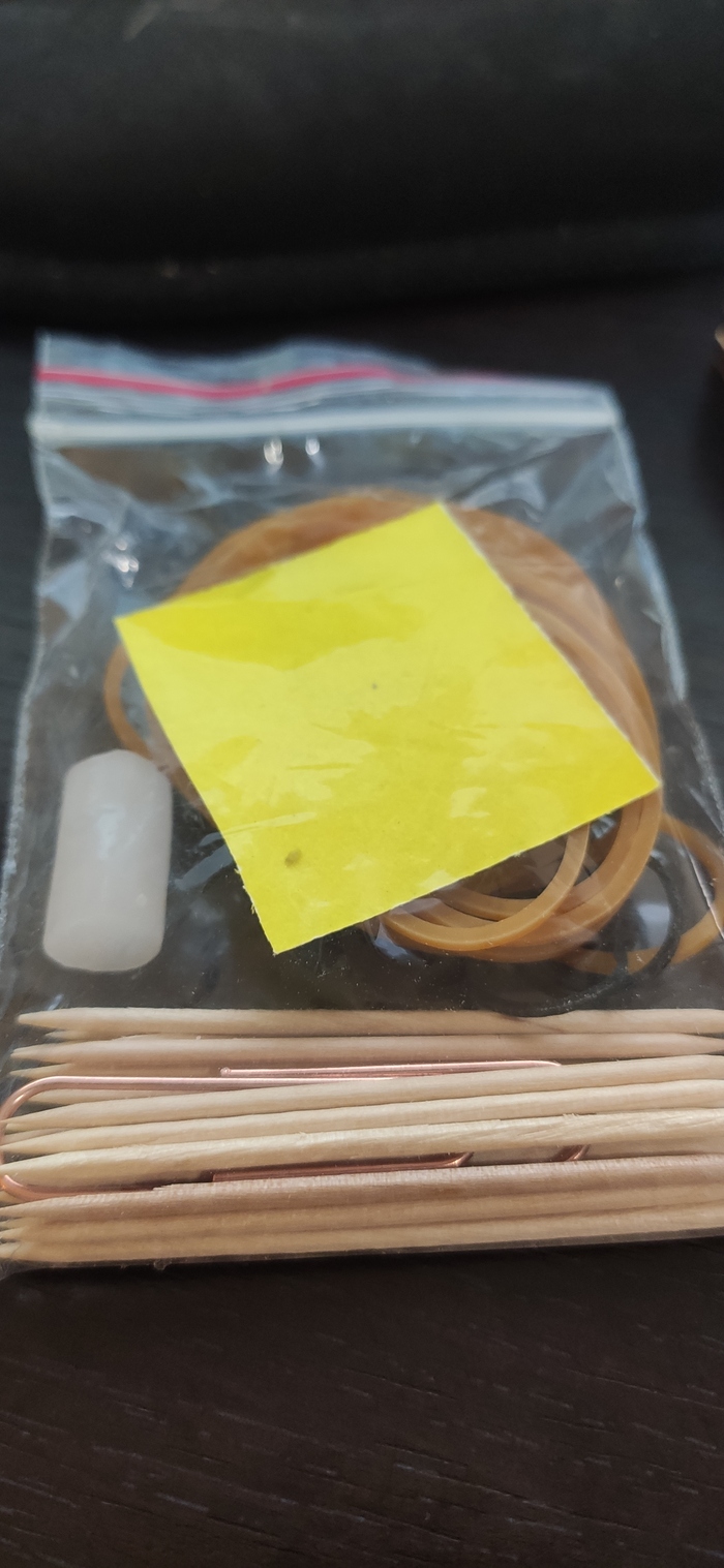 Итак, тут резинки, зубочистки, наждачная бумага, воск и медная скрепка, нужна что бы протягивать резинки.