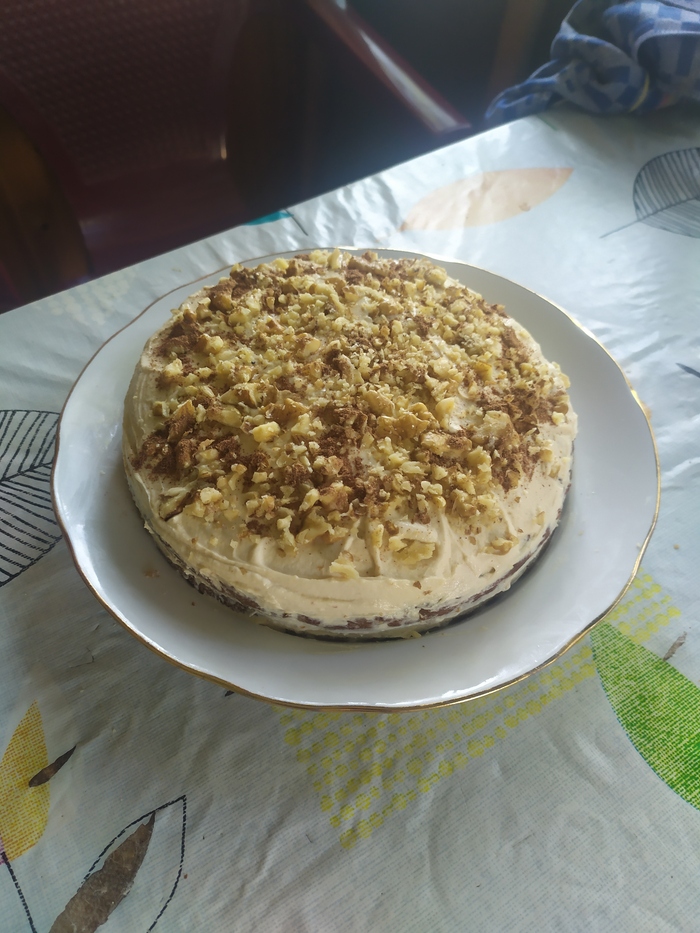 Верх посыпать орешками, я грецкими, достаточно 50-60 гр, а вообще любыми, можно тем же арахисом, который слегка измельчить толкушкой. Чтобы орехи были достаточно крупными. Присыпать корицей.